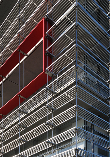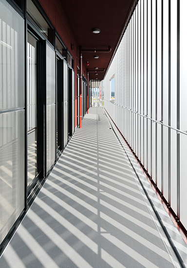 外部にはメンテナンスを兼ねた庇を設けることで、照明・空調負荷低減、及び躯体保護を図り、太陽光発電による自然エネルギーの活用等により環境負荷低減を図っています。