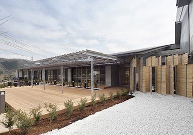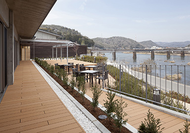 川の対岸や近傍を走るJR津山線からの景観は、大小の勾配屋根や緑の法面、落ち着いた色調で周辺環境との調和に配慮しています。